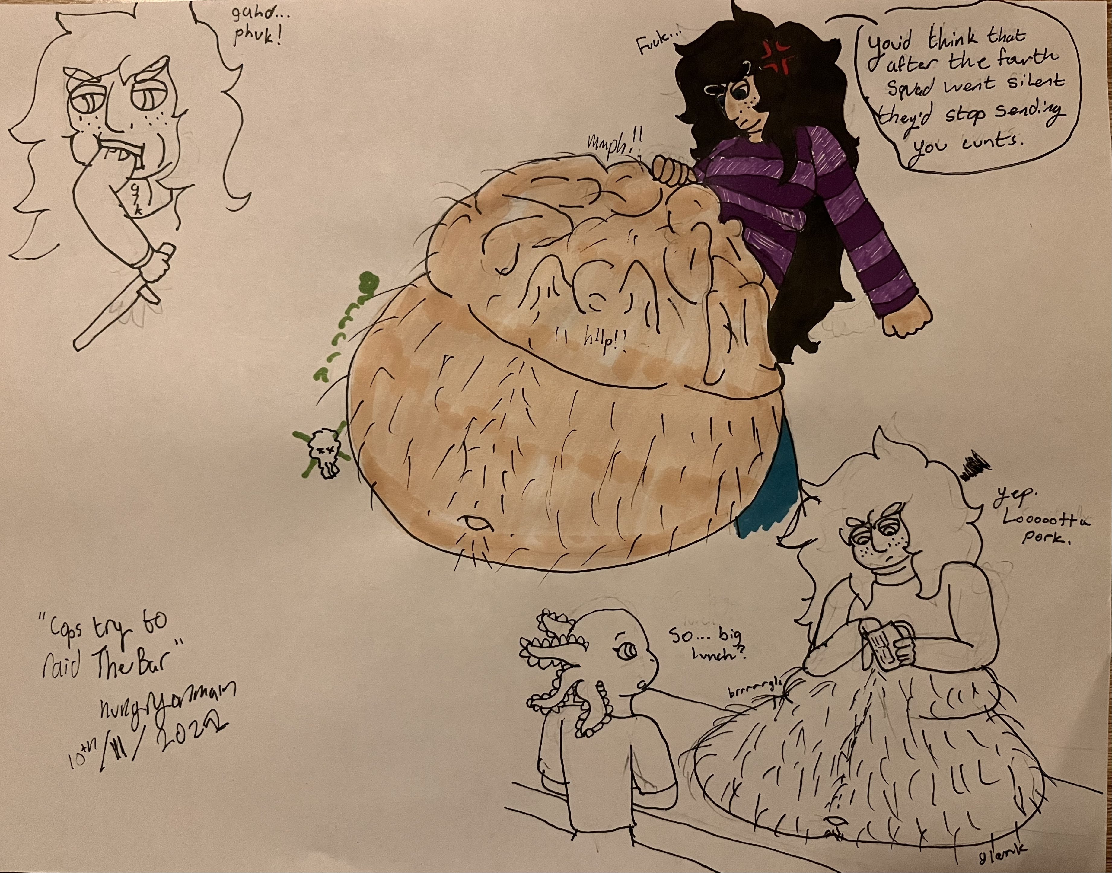 PORK FOR LUNCH: The local PD learns the hard way that Ian isn’t the type to just let them raid his bar. Also, an axolotl patron is there, because I like axolotls.
