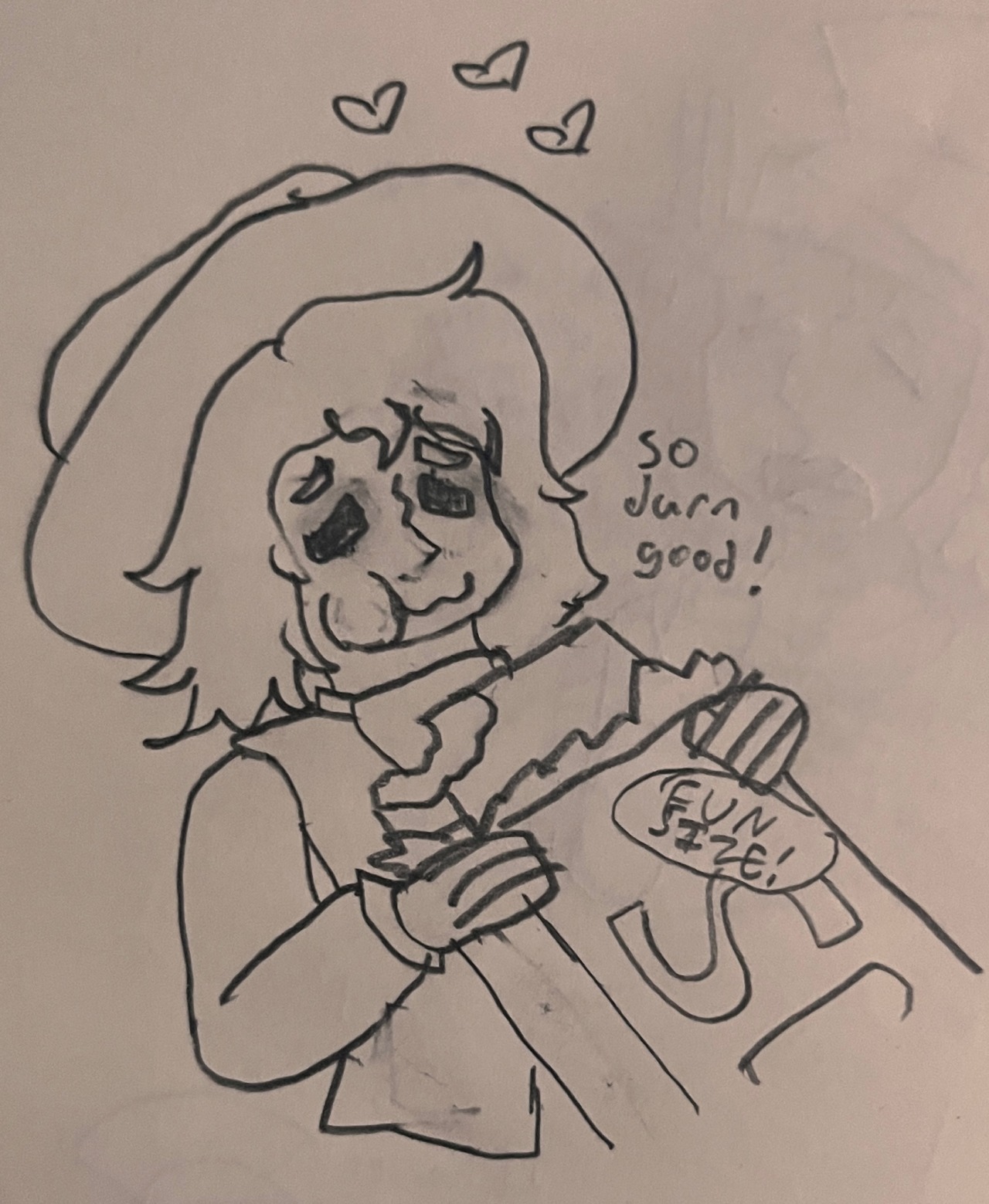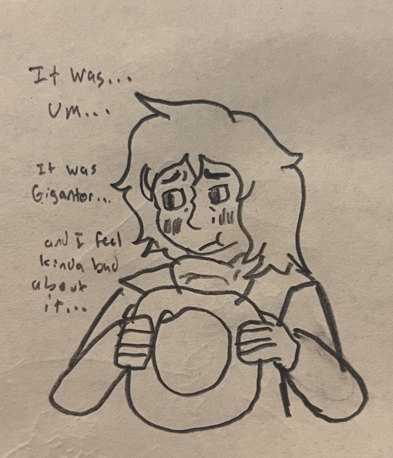"Ocky n’ I scrounge fer change on our drives, n’ when I have enough I get a big ol’ bar of it from the vendin’ machine. It never really fills me up, I basically got a black hole in my guts, haha."